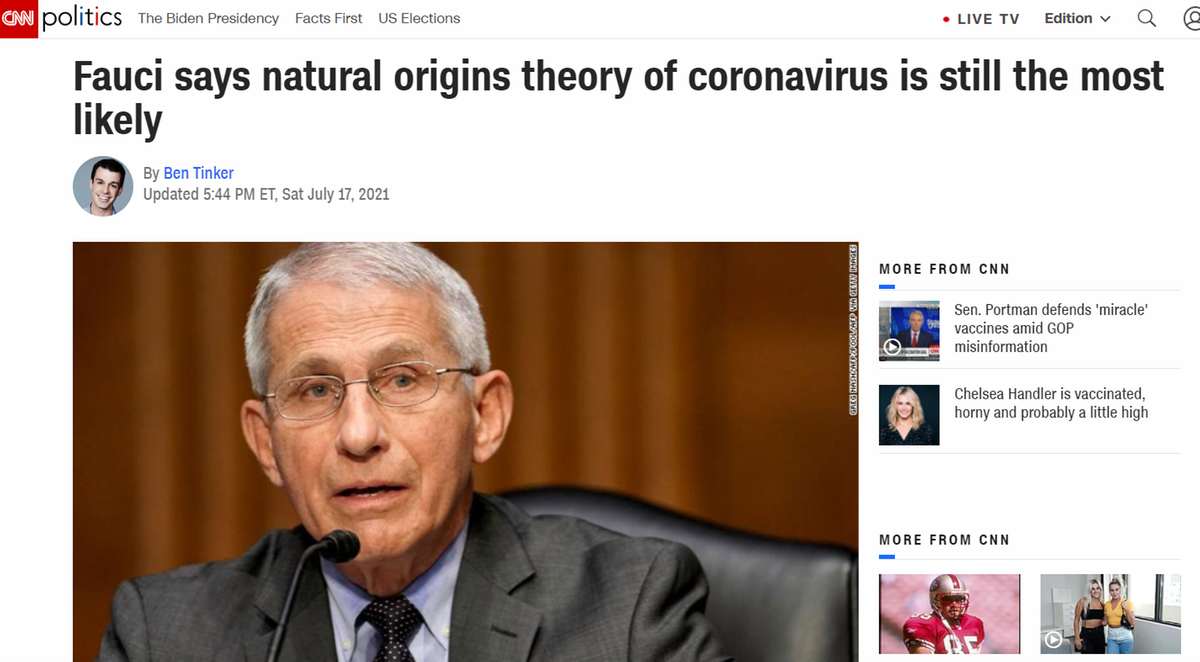据美国有线电视新闻网(CNN)7月17日报道, “新冠病毒来源最可能的解释是从动物宿主到人类的自然进化,”美国国家过敏和传染病研究所所长安东尼·福奇表示。