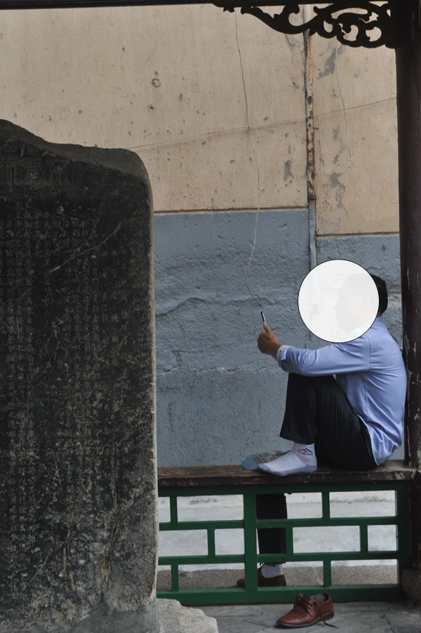 近日,秦州文庙的石碑陈列亭内,一个中年人脱掉鞋子,坐在长廊的护栏上很投入地看手机。文庙的石碑陈列处是一个文化旅游胜地,这样邋遢的形象不仅让景区蒙尘,也有损我市的形象。(新天水记者 杨晓斌 摄)