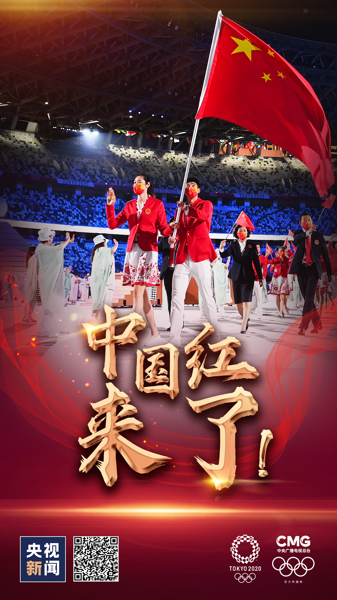 女排运动员朱婷、跆拳道运动员赵帅高擎五星红旗,中国体育代表团步入东京奥林匹克体育场。
