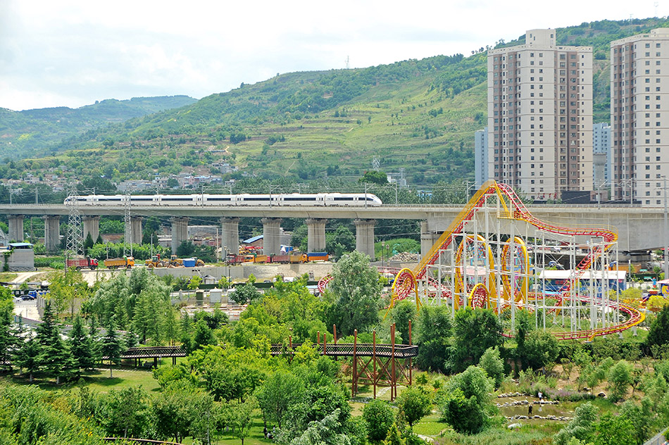 7月24日,一列途经天水的高速列车驶过麦积区马跑泉公园南侧。