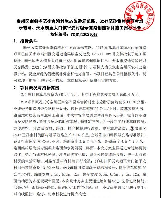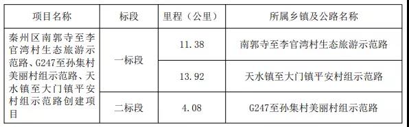 近日,天水市公共资源交易中心发布《秦州区南郭寺至李官湾村生态旅游示范路、G247至孙集村美丽村组示范路、天水镇至大门镇平安村组示范路创建项目施工招标公告》。公告中对项目的基本信息进行了详细的介绍,详情如下: