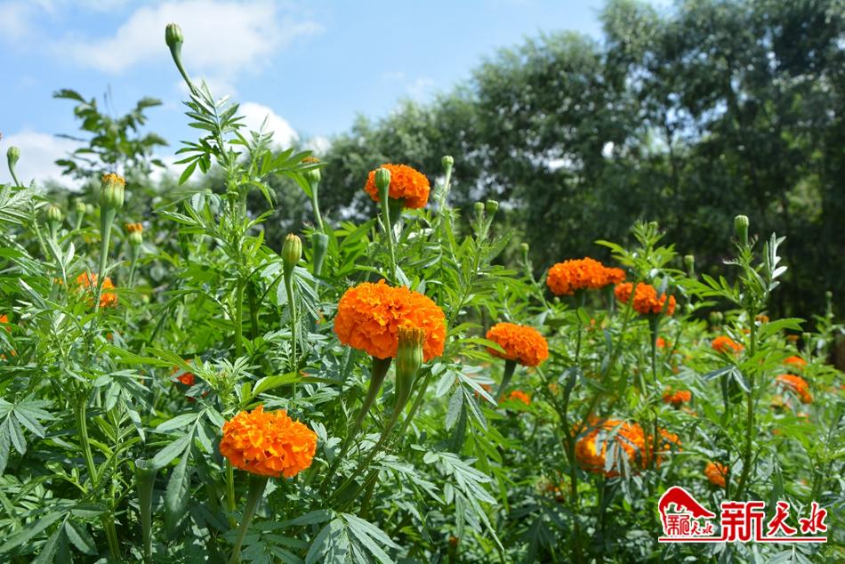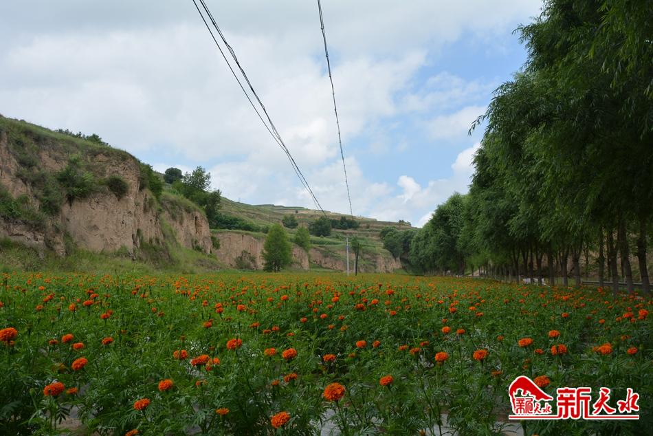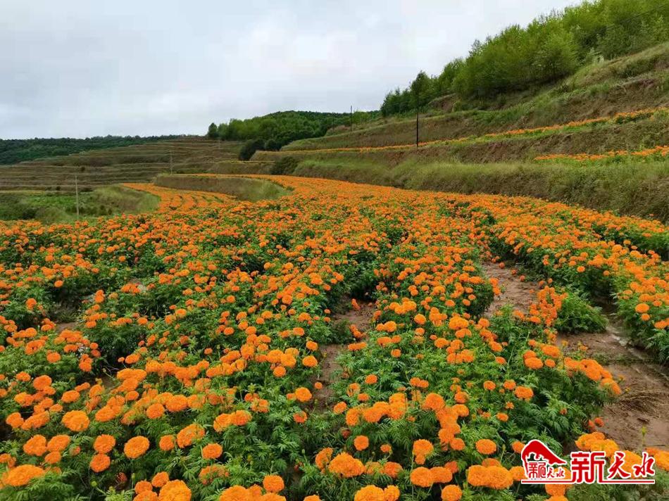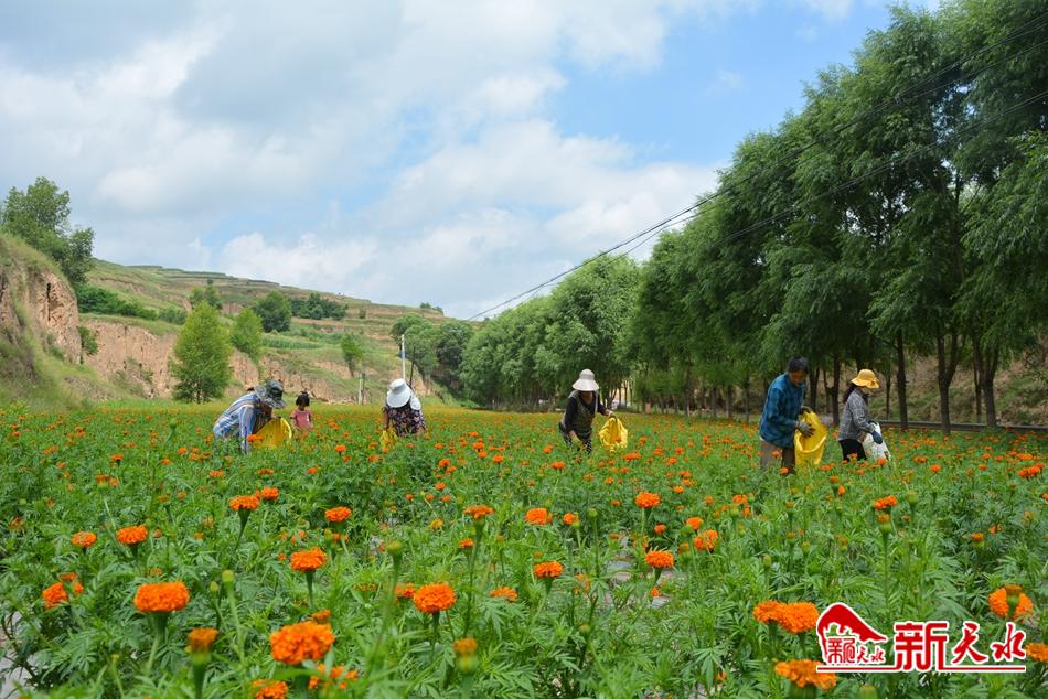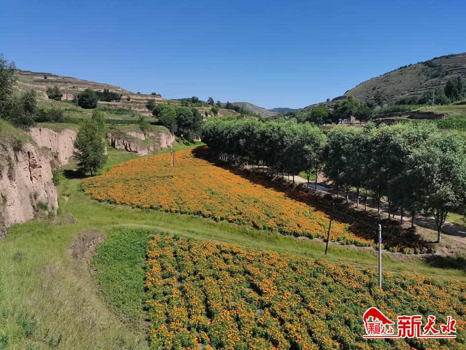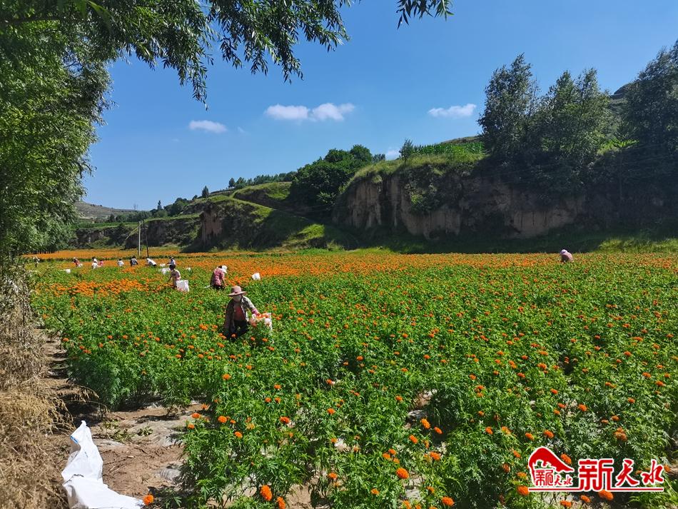 盛夏时节,正是万寿菊的收获季,7月22日,在位于甘谷县大庄镇杨家坡村的千亩万寿菊种植基地内,大片万寿菊花开正艳,十几位工人正忙碌地采摘花朵,成片的菊花绵延数千米,宛如橙色地毯铺遍田间。