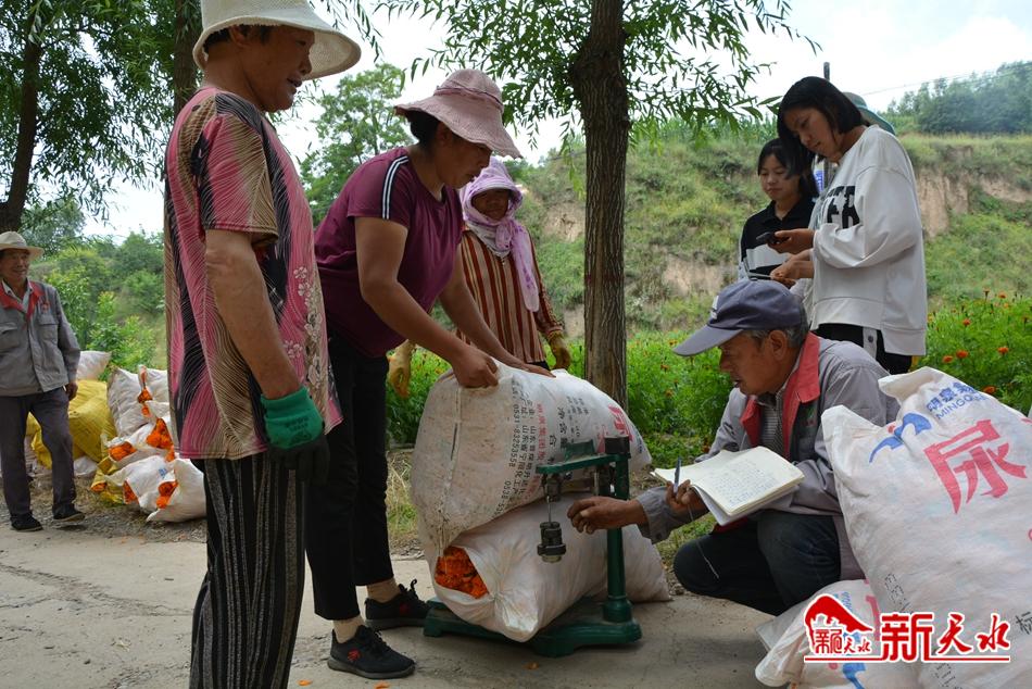 记者看到,村民们将菊花摘满后,会一袋一袋地抬过去称秤,而在这些称秤的人群中,有几个十五六岁的女孩。“这几个娃都在甘谷县城上学呢,正好放假回家来帮大人干活挣钱,孩子都很懂事,学习好,干农活也不嫌累。”村民们纷纷附和道,万寿菊采摘期正好凑上暑假,学生们在家门口就能勤工俭学,一个假期能挣上千元。