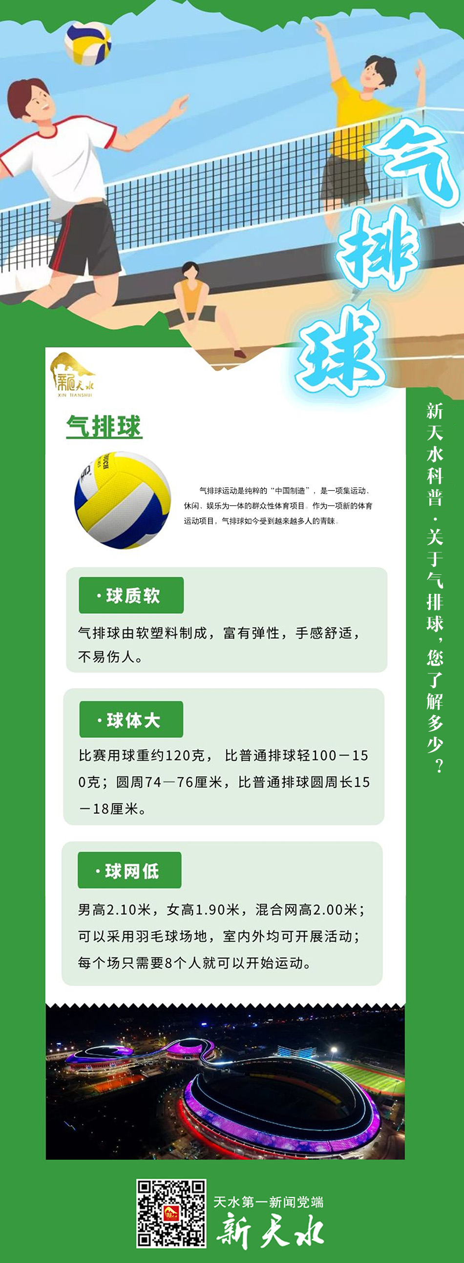 今天,全国第十四届运动会气排球比赛天水赛区比赛将在天水市体育中心体育馆举行,为期5天。那么,到底什么是气排球?关于气排球,您又了解多少呢?我们一起来看看吧!