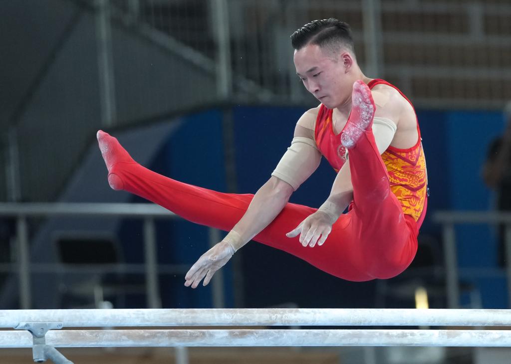 7月26日,中国队选手肖若腾在双杠项目比赛中。新华社记者 程敏 摄