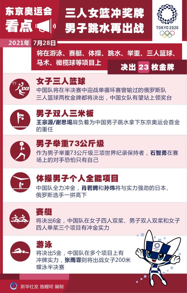 东京奥运会28日将在游泳、赛艇、体操、跳水、举重、三人篮球、马术、橄榄球等项目上决出23枚金牌。男子足球28日将结束小组赛争夺。羽毛球、乒乓球都将继续单项角逐,其中羽毛球混双和乒乓球男、女单打都将决出四强。