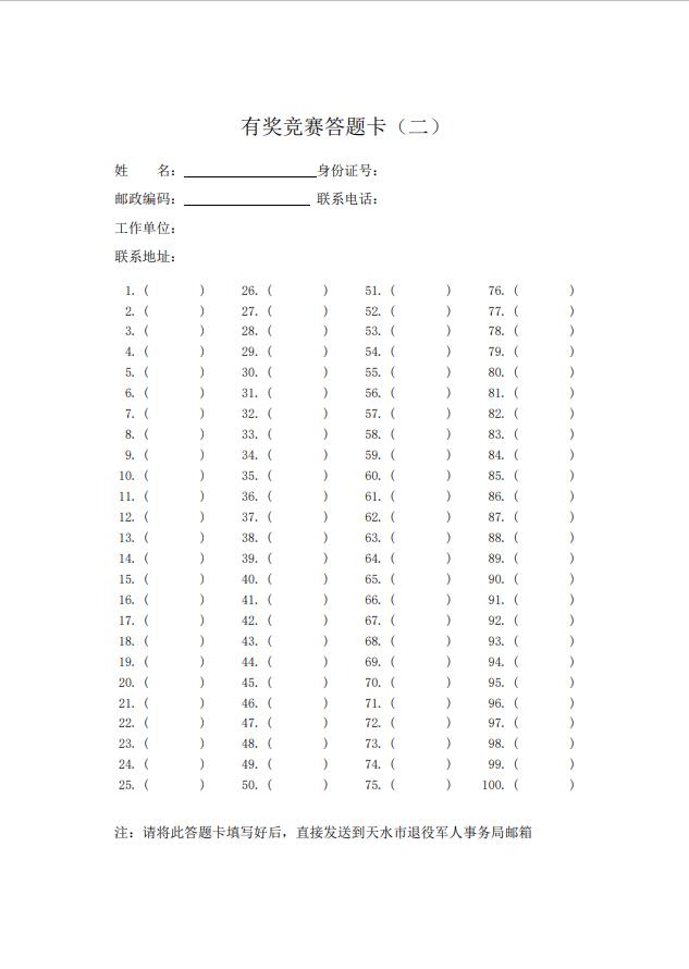 4.竞赛题型为单项选择题,共计100题,每题1分,总分100分。参赛者(参赛单位)可选择填写答题卡一或卡二进行答题,选答题卡一的参赛者(参赛单位)请统一寄送到秦州区金家庄政务中心市退役军人事务局双拥科(信封右下角注明“《中华人民共和国退役军人保障法》《中华人民共和国军人地位和权益保障法》知识竞赛”字样;选答题卡二的参赛者(参赛单位)请统一发至市退役军人事务局邮箱(345555918@qq.com);以邮戳和发送邮箱时间为准,过期为无效答卷。