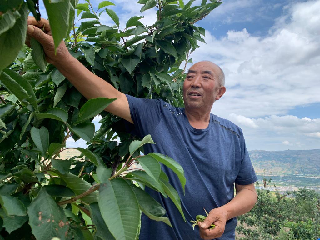 胡对生正在摘去樱桃树的枯叶。新华社记者张玉洁摄