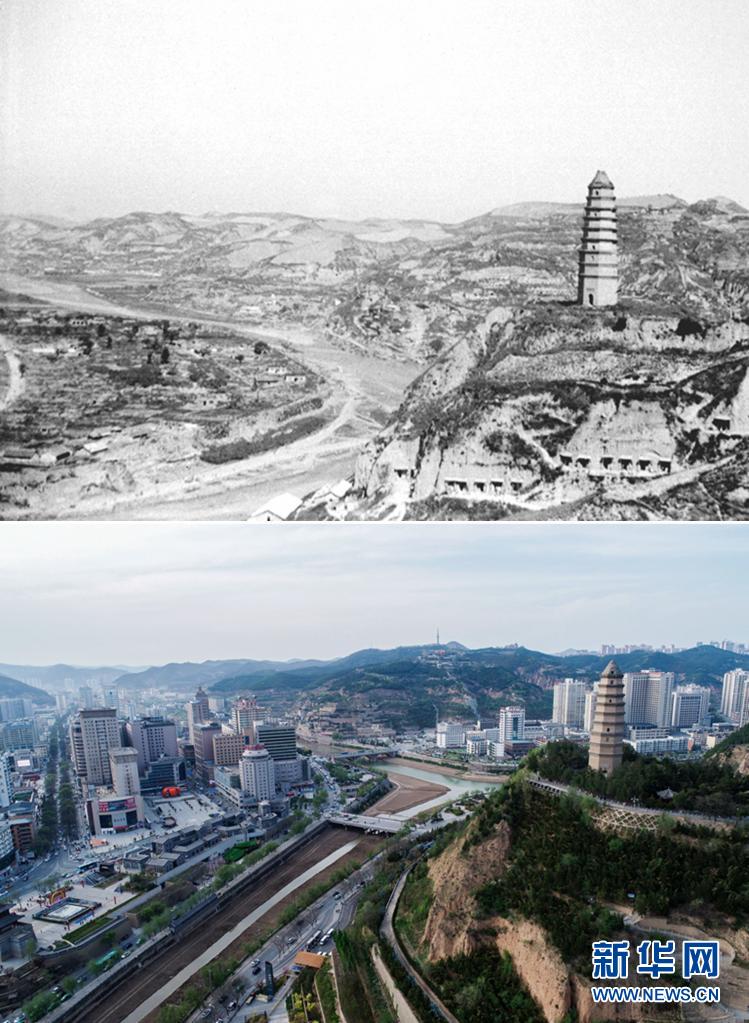 拼版照片:上图是1938年拍摄的延安(资料照片),下图是2021年4月22日拍摄的延安市(无人机照片,新华社记者张博文摄)。新华社发