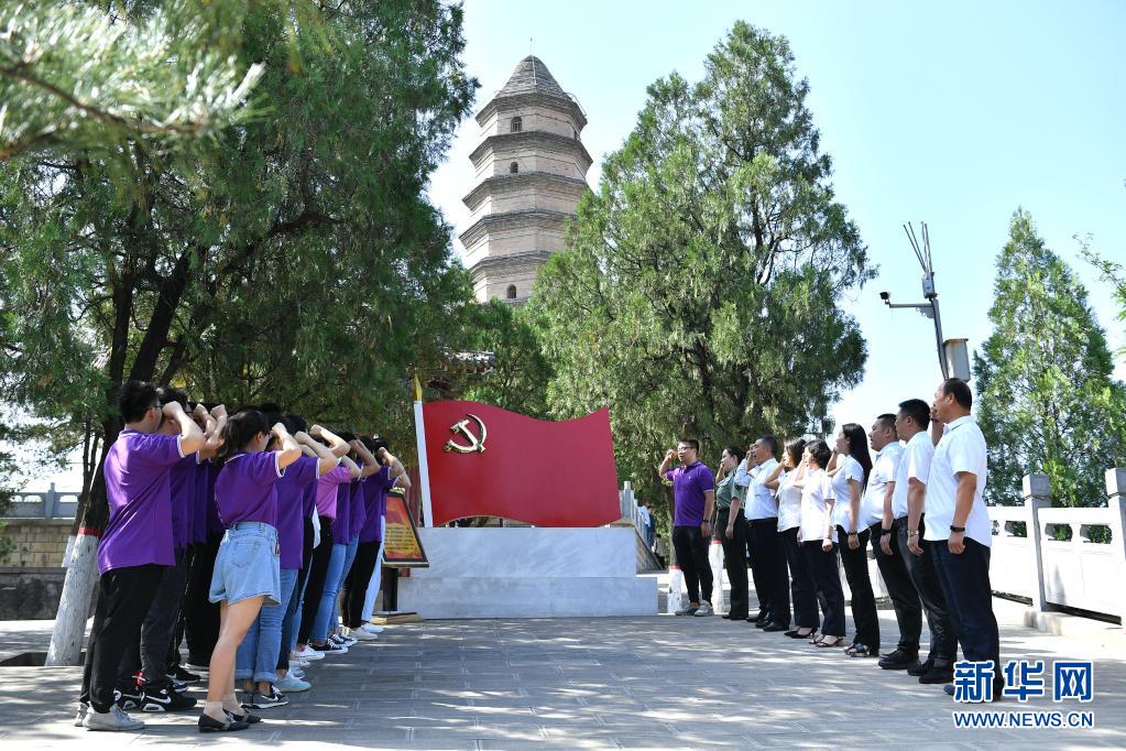党员干部在延安市宝塔山重温入党誓词(2020年6月29日摄)。新华社记者 张博文 摄
