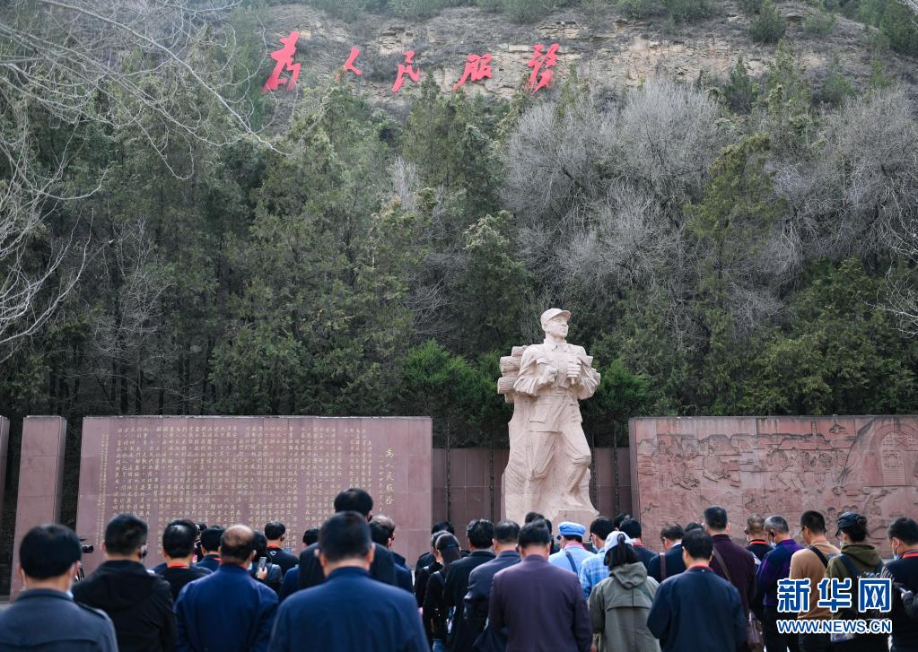 党员干部在延安市张思德广场进行现场教学活动(3月29日摄)。新华社记者 张博文 摄
