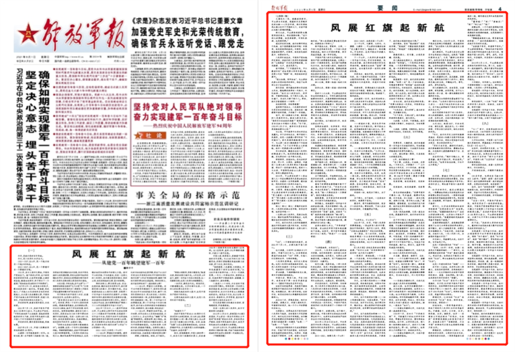 从建党一百年眺望建军一百年。此时此刻,每一名中国军人与祖国人民一道,共享我们党卓越的成功实践,共庆中华民族伟大的凤凰涅槃,同时也在聆听统帅的嘱托和号令,领悟这支党缔造和绝对领导的人民军队在新征程上肩负的历史重任。