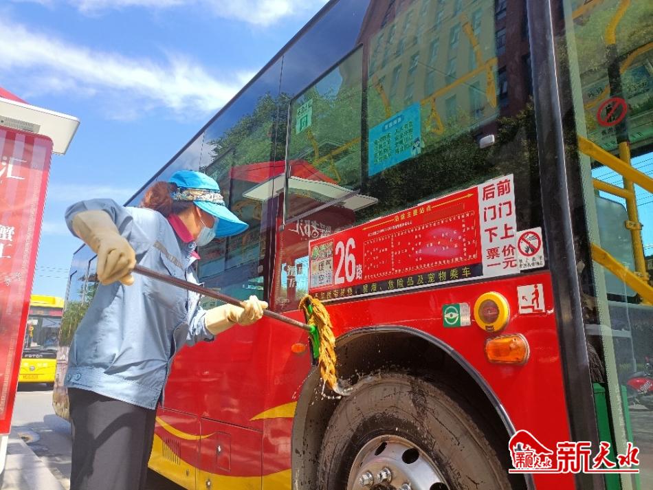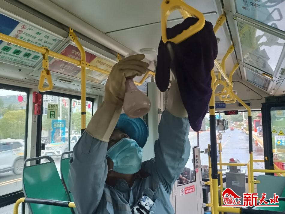 记者来到市人社局公交站时,正好有一辆26路公交车进站,因为是终点站,等乘客全部下车后,师建辉和她的另外2名同事分别拿着抹布、笤帚、拖把和喷壶,疾步登上车厢,迅速分散在车厢的不同位置埋头干起来,擦拭玻璃、座椅、拉环,清扫 死角垃圾拖地面,最后喷洒消毒液,他们交叉作业动作连贯一气呵成,犹如在打战 。因为她们穿着同样的工作服,为了防疫和防晒,头部和脸部被帽子和口罩裹得严 严实实,以至于记者分不清哪位是师建辉,4分钟后,车厢内的卫生打扫完毕,她 们3人下了车,司机和乘客随后上车,公交车驶出公交站。