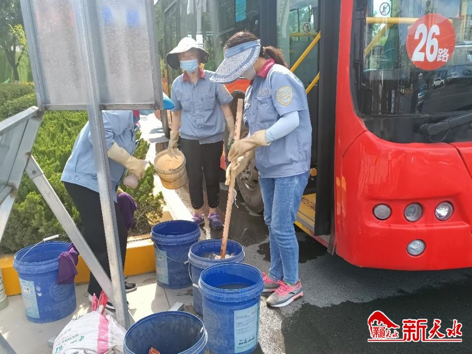 就在等候下一辆26公交车进站的间隙,记者采访了师建辉,从票员转岗到保洁 员,师建辉从事公交车保洁已经有10多年,先后在不同的保洁点干过,最属市人社 局公交站有些特殊,虽然说这个站是26路公交车的首末站,但是一直没有站房,她 们4个保洁员一年四季露天工作,遇到下雨,就躲进人社大厦避雨,烈日下,就靠路边的行道树躲太阳。这几天虽然持续高温,但是,她们4人每天对20多辆26公交车的保洁质量始终没有降低,每次打扫完一辆车就是汗流浃背,当对面公交车进站 后,她们又得拿着工具,提着水桶过马路去打扫,而水桶里打扫卫生的水都是21路公交车从和谐家园首末站捎过来的,一同捎来的还有公交公司为了她们防暑降温,装在电壶里的绿豆汤。