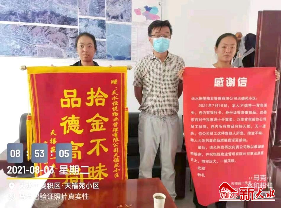 新天水讯【特约通讯员窦耀辉】8月3日,麦积区道北天禧苑小区保洁员李风兰和方勤收到写有“拾金不昧、品德高尚”的锦旗和感谢信,拿到失而复得背包的失主以此举感谢好心人。