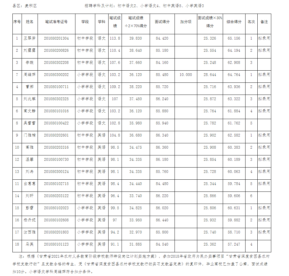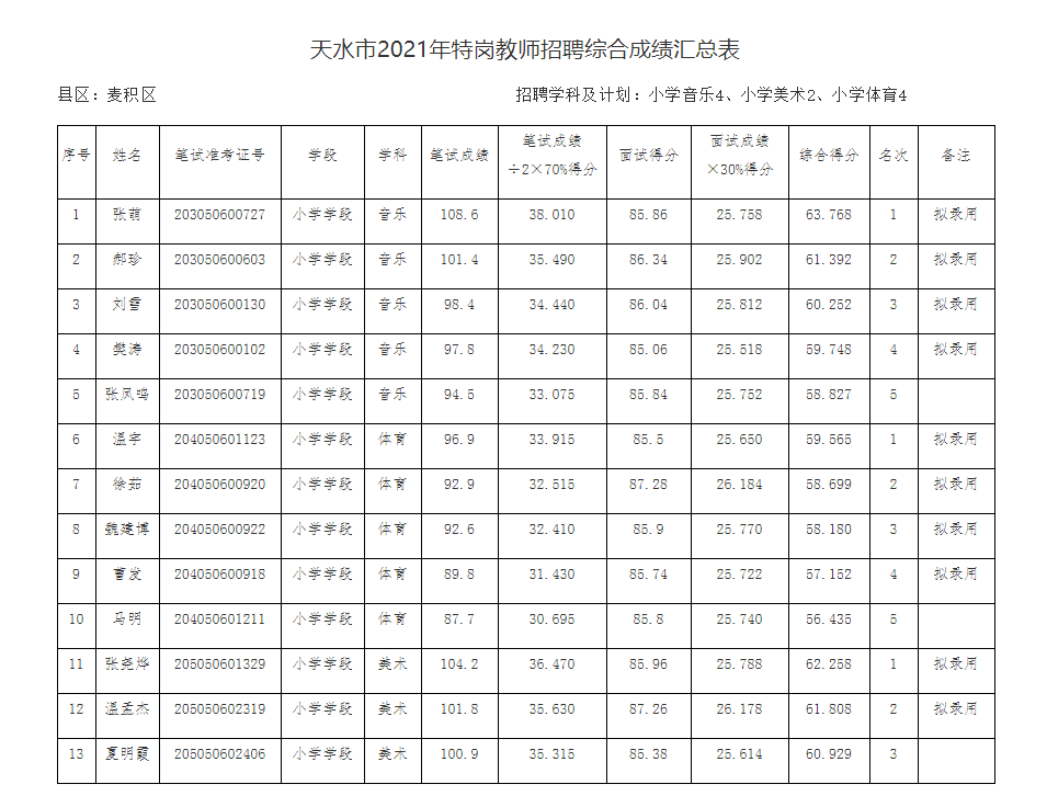 天水市麦积区2021年招聘特岗教师综合成绩及拟录用人员公示