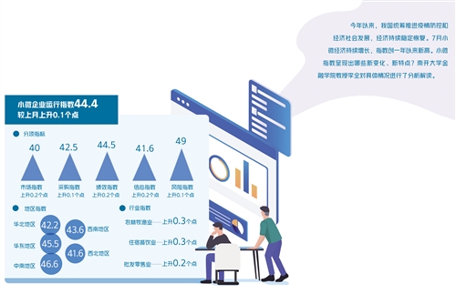 7月份,“经济日报-中国邮政储蓄银行小微企业运行指数”为44.4,较上月上升0.1个点。分项指数呈现“五升三平”态势。其中市场指数为40,上升0.2个点;采购指数为42.5,上升0.1个点;绩效指数为44.5,上升0.2个点;扩张指数为42.6,与上月持平;信心指数为41.6,上升0.2个点;融资指数为52.9,与上月持平;风险指数为49,上升0.1个点;成本指数为63,与上月持平。自2020年7月以来,小微企业运行指数稳中有升。