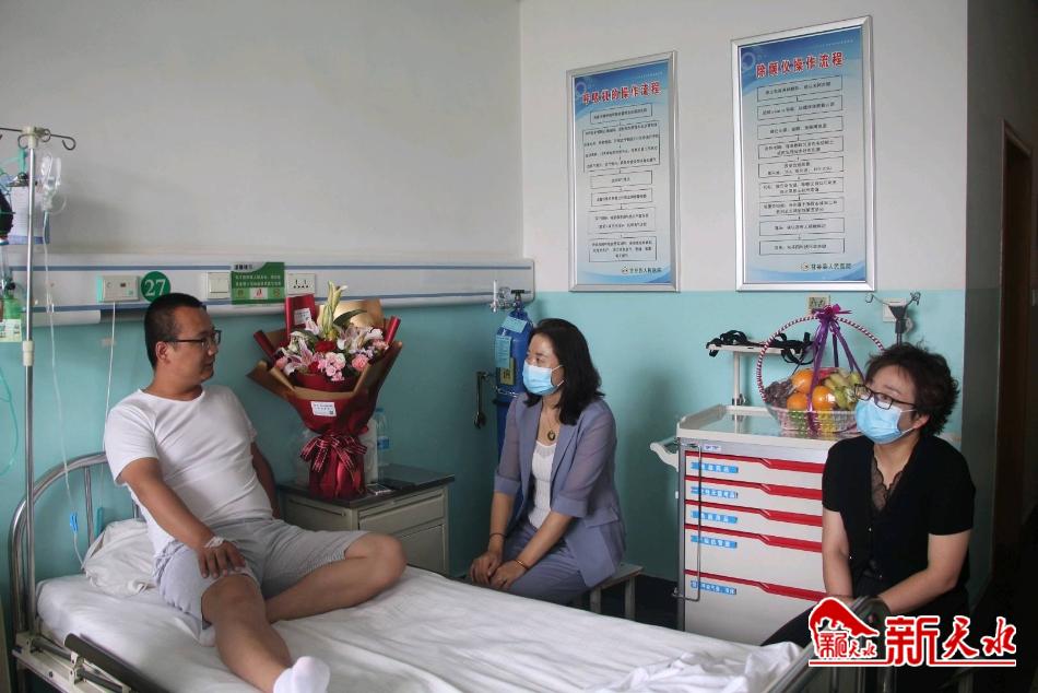 在全民免疫屏障构建工作中,正是一个个像杨根深一样的基层医务人员,舍小家,为大家,不辞劳苦,坚守岗位奉献担当,才守得一方百姓的健康平安。 8月11日上午,甘谷县卫健局领导到县医院看望慰问杨根深同志,领导们向连日来为了保护人民群众生命健康,兢兢业业、恪尽职守坚持在疫苗接种一线的杨根深同志表示衷心感谢,对他辛勤工作承担疫苗接种任务的担当、奉献精神表示肯定和赞扬,并叮嘱他注意休息,早日恢复健康。甘谷县卫健局领导说,基层医务人员是疫苗接种工作的主力军,在前期筹备、值班值守、后勤服务等方面做了大量工作,各单位在抓好疫苗接种工作的同时,务必做好防暑降温工作,完善轮岗替岗工作制度,保证工作人员合理休息时间,确保所有医护人员人身健康安全。