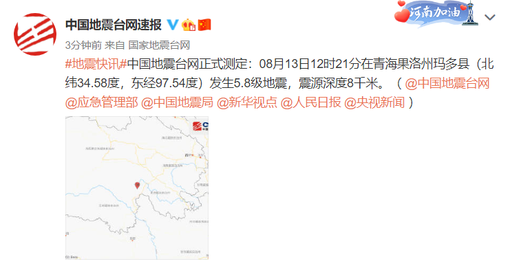 中国地震台网正式测定:08月13日12时21分在青海果洛州玛多县(北纬34.58度,东经97.54度)发生5.8级地震,震源深度8千米。