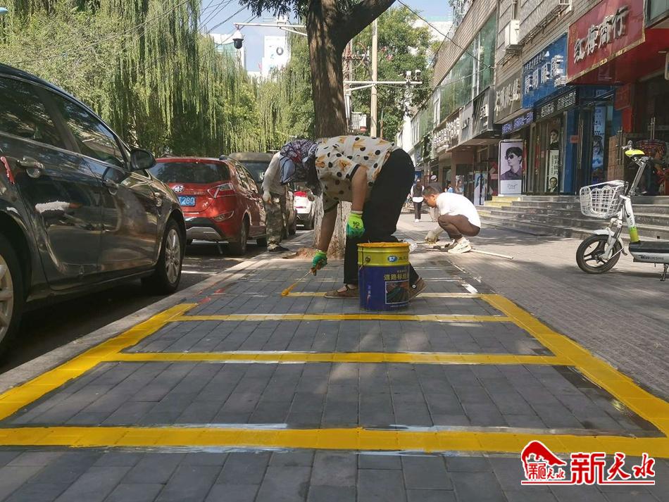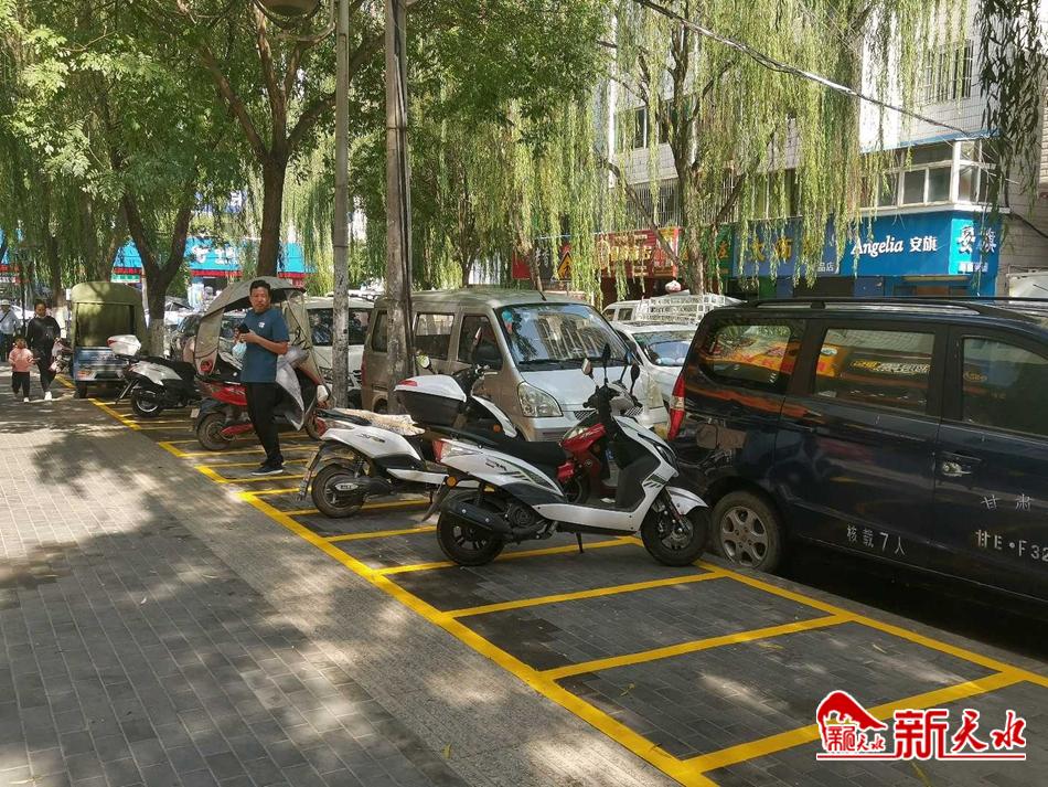 为了解决电动车、自行车乱停乱放问题,武山县交警大队在县城部分路段的人行道上规划了电动车、自行车专属停车位。图为8月14日,工作人员正在施画专属停车位标识。