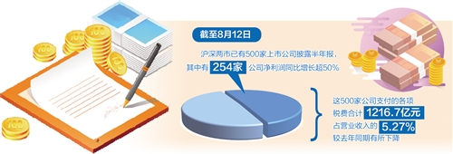 从上市公司陆续披露的2021年半年度报告来看,政策效应正在逐步显现。上半年,大部分上市公司税费负担有所减轻,业绩普遍回升,且不少企业业绩恢复强劲。根据同花顺iFinD数据显示,截至8月12日,沪深两市已有500家上市公司披露半年报,其中有254家公司净利润同比增长超50%;同时,这500家公司支付的各项税费合计1216.7亿元,占营业收入的5.27%,较去年同期有所下降。