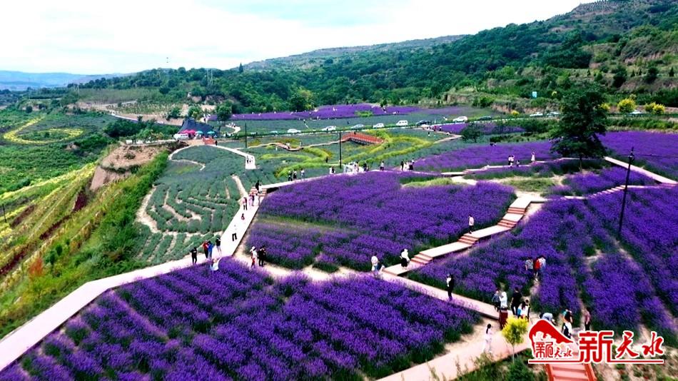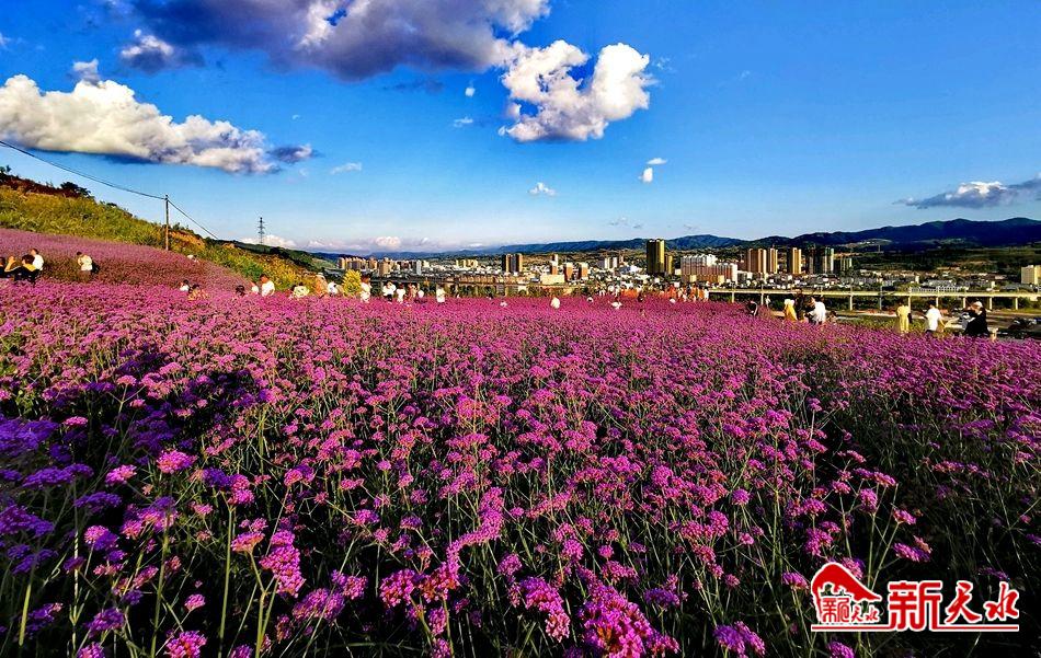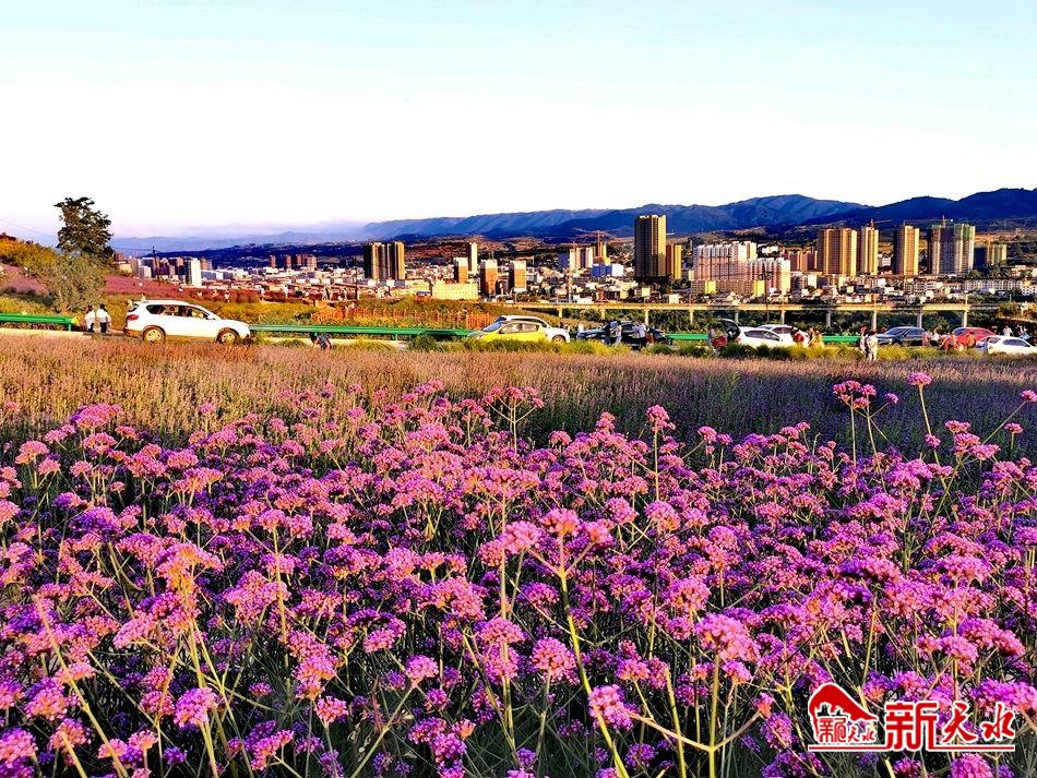 沿栈道拾级而上,放眼望去,蓝天白云下,紫色花海绵延至远方,目光所及是青山掩映中的清水县城,澄澈的牛头河水自在流淌。而近处,三五成群的游人在花田的步道上赏花游玩,今年,园内也新增了便于游客拍照的造型,与紫色花海交相辉映。人在花中,景在画中,一幅紫色的油画浑然天成。