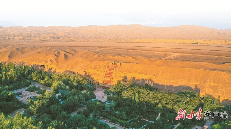 清晨第一缕阳光照亮敦煌莫高窟,这颗世界文明长河中的璀璨明珠散发出迷人的光芒。