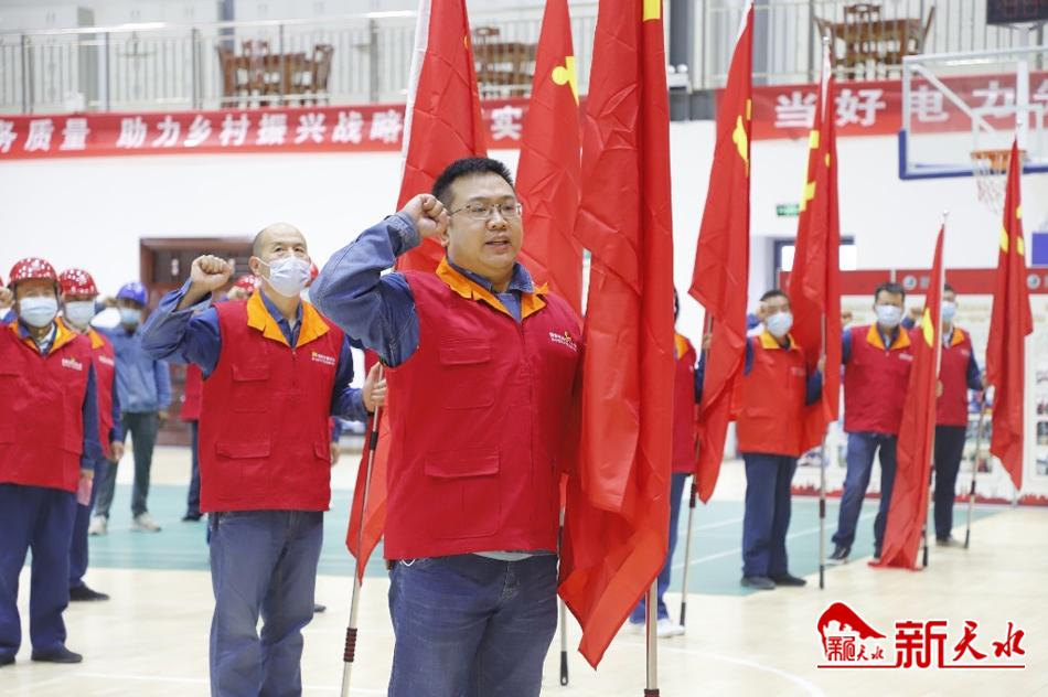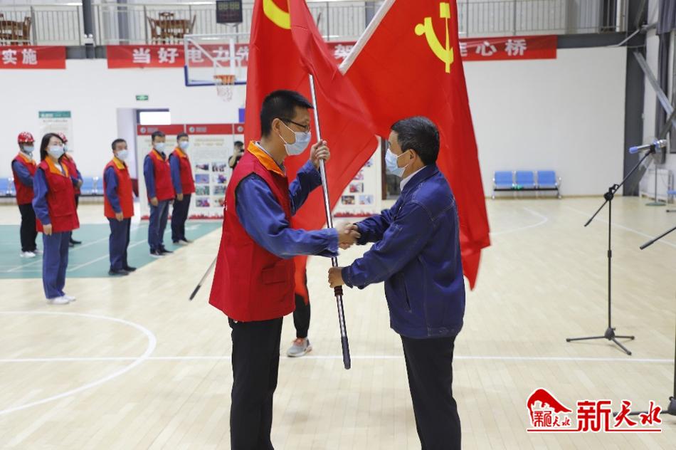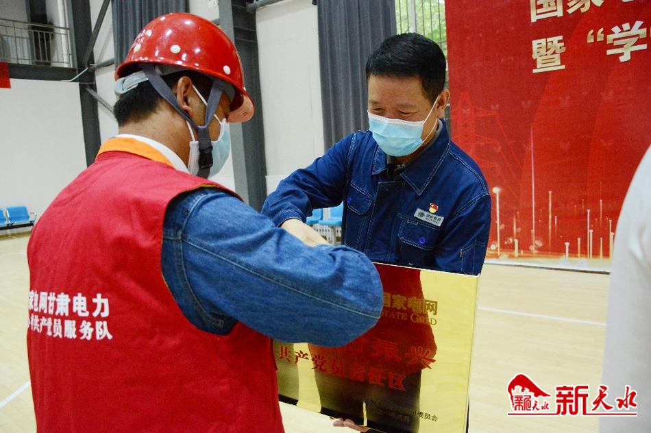 在启动仪式上,国网甘肃电力连心桥(天水花牛)共产党党员服务队队长从国网天水供电公司党委书记、副总经理李二雎手中接过党旗,服务队全体队员向共产党员服务队公约宣誓。国网天水供电公司向“服务乡村振兴共产党员责任区”“天水花牛—光明驿站”代表授牌,把全体电力人的使命和承诺倾注在一面面金光闪闪的匾牌上,让他们像镜子一样映照电力人的担当和使命。