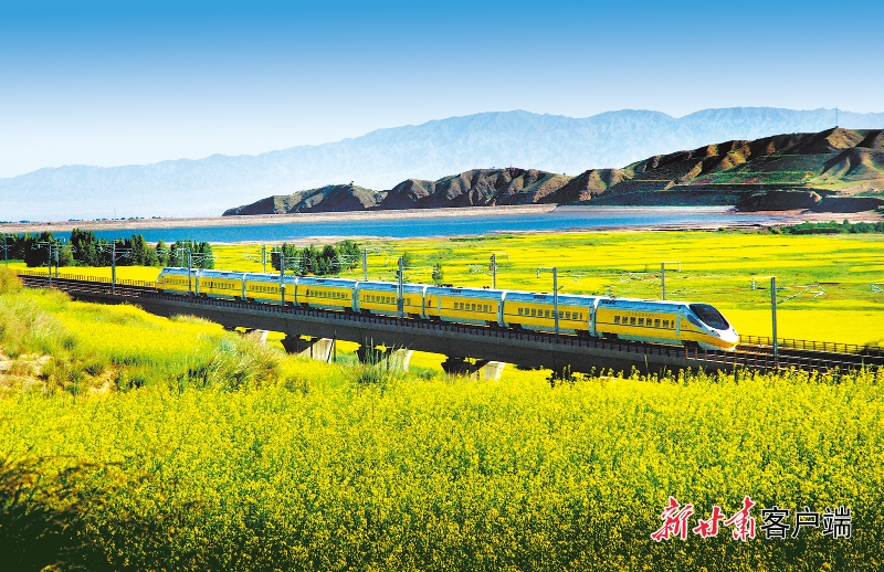 祁连山下一列动车正穿过油菜花海。新甘肃·甘肃日报通讯员 周俊