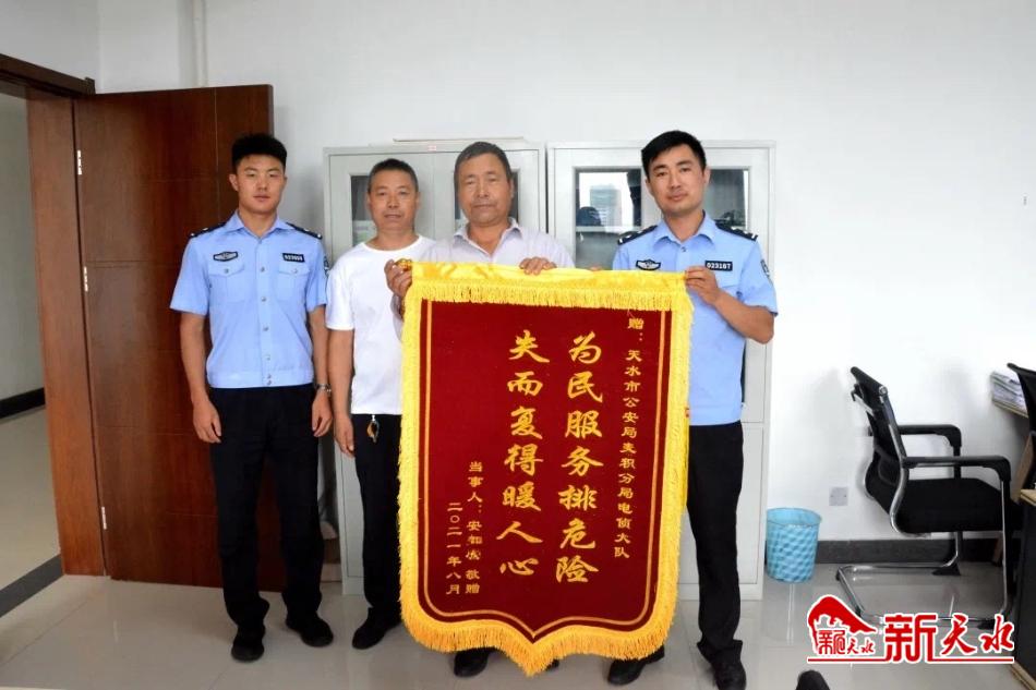 新天水讯【记者王晓华】“真是太感谢你们了,及时为我们挽回了经济损失。”8月20日上午,麦积区五龙镇的安先生将一面写有“为民服务排危险 失而复得暖人心”的锦旗送到天水市公安局麦积分局电信网络新型违法犯罪侦查大队,以此表达对办案民警远赴千里侦破案件,挽回其经济损失的感激之情。