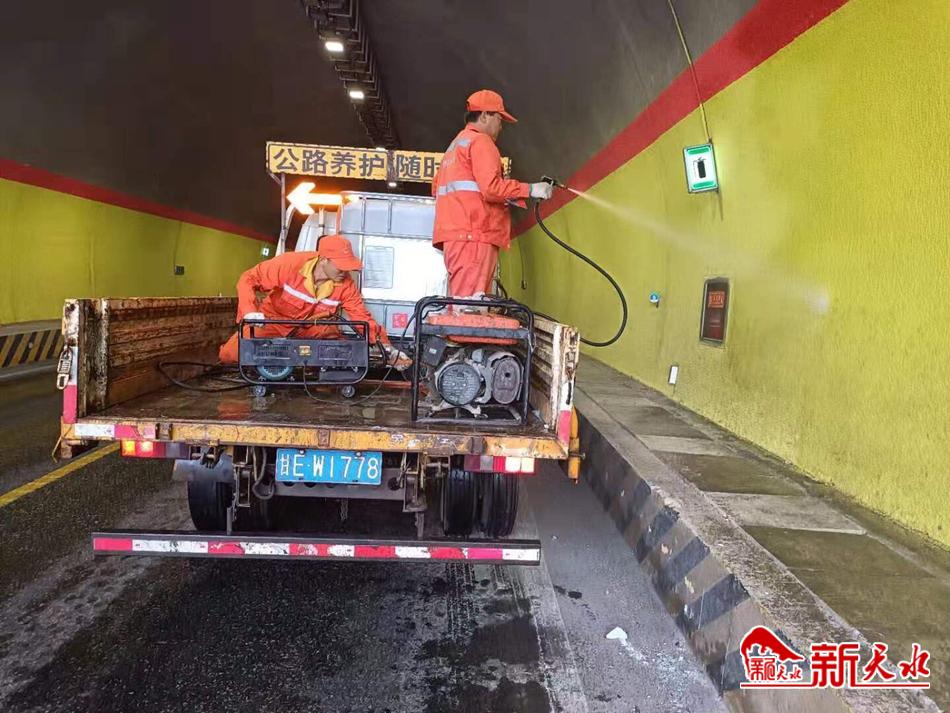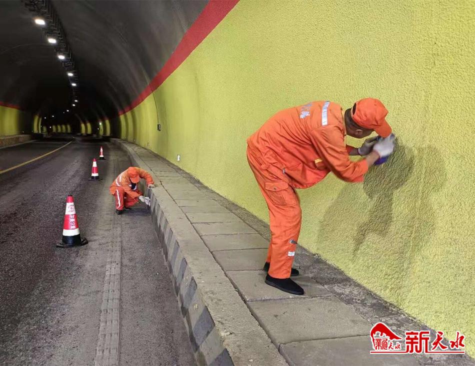 近日,武山公路段组织人员对省道208线马营至马街公路界牌山隧道的侧墙、轮廓标、突起路标、标线、安全带等开展大清扫、大清洗。