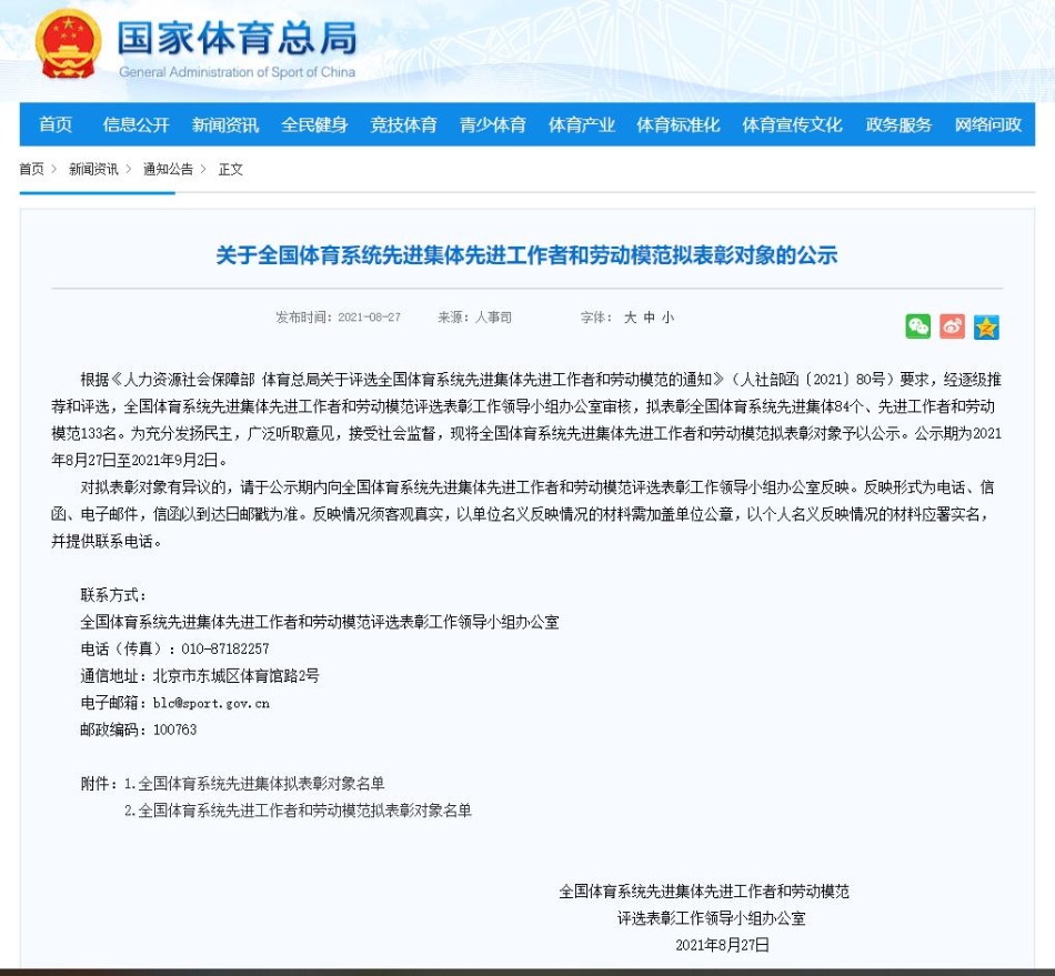 8月27日,国家体育总局官网发布了《关于全国体育系统先进集体先进工作者和劳动模范拟表彰对象的公示》(以下简称《公示》)。《公示》显示,拟表彰全国体育系统先进集体84个、先进工作者和劳动模范133名。为充分发扬民主,广泛听取意见,接受社会监督,现将全国体育系统先进集体先进工作者和劳动模范拟表彰对象予以公示。公示期为2021年8月27日至2021年9月2日。