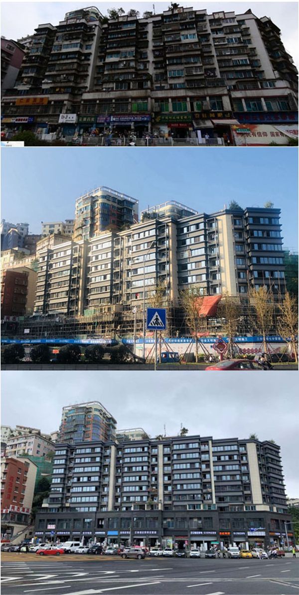 贵阳市云岩区老旧小区改造前(上)改造中(中)改造后(下)拼版对比图。贵阳云岩康厦城市开发建设公司供图
