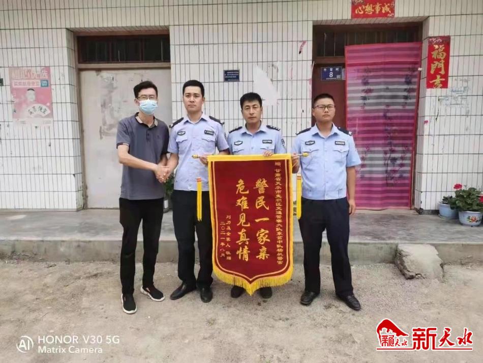 新天水讯【记者 王晓华】8月28日,市民刘先生家人将一面写有“警民一家亲 危难见真情”的锦旗送到麦积公安分局交警大队东岔中队民警手中,对民警、辅警及时救助群众的行为表示衷心的感谢。
