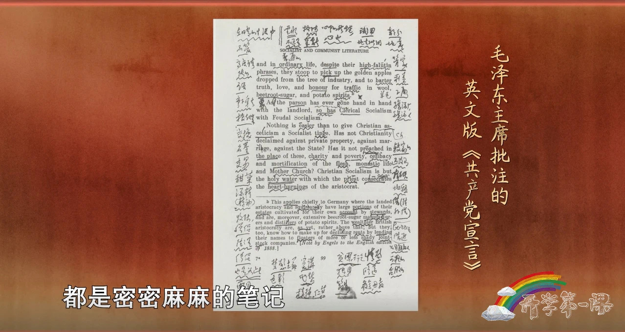 六十多岁的毛泽东主席想学一些马克思主义经典著作的英文本,他第一本选的也是《共产党宣言》。阅读的时候,毛泽东主席一边思考一边做着笔记,从第一页到最后一页,都是他密密麻麻的批注。