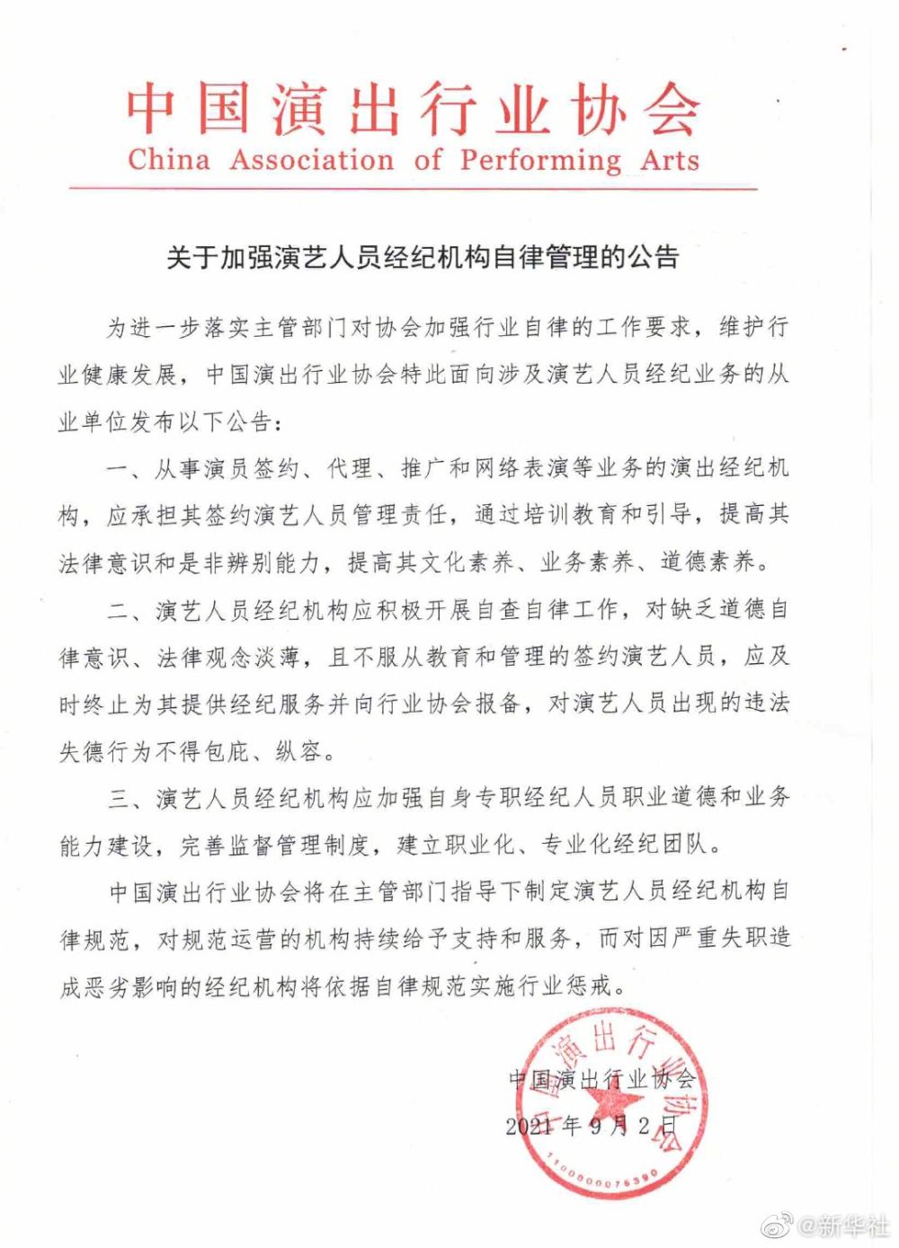 中国演出行业协会:经纪机构纵容违法失德行为将受惩戒