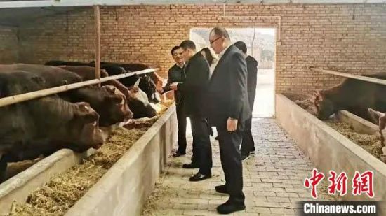 邱军(前)生前调研华池县肉牛养殖业。(资料图) 华池县委宣传部供图