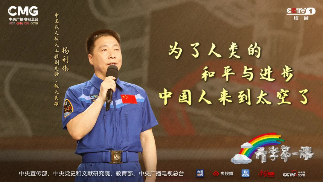 “党和国家为我们铺就了‘飞天之路’,十四亿中国人民托起了我们,把我们送入浩瀚的太空。”在节目中,杨利伟倍感自豪地说道,“如今,我国的航天事业已经进入了‘空间站时代’,未来中国空间站也将成为全人类在外太空共同的家。”演讲最后,杨利伟给同学们送上开学寄语,号召大家一起用知识和理想,照亮美好的明天。