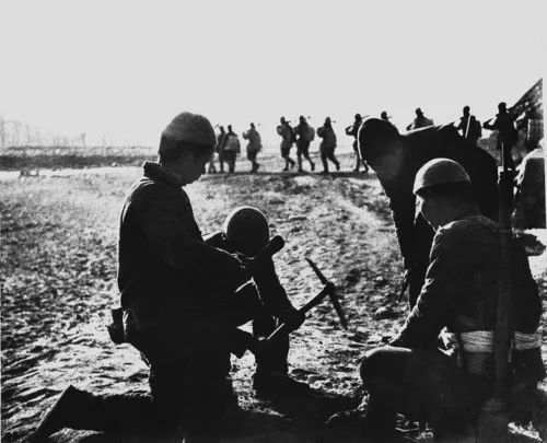河北平山县民兵埋设地雷配合主力作战。新华社发(石少华摄)