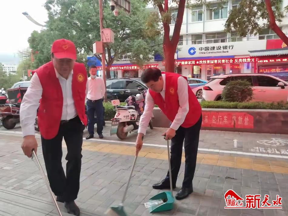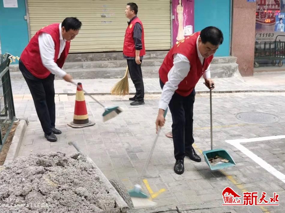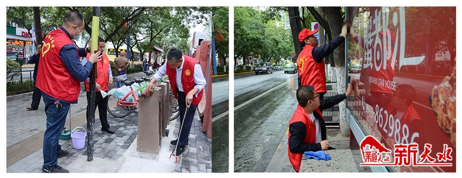 9月3日,天水市政法委开展创建全国文明城市“包街包巷包小区”志愿服务活动。志愿者身穿红马甲来到“包街”责任路段,清扫人行道路面、擦洗公共设施、清理沿街商铺外墙壁和玻璃门上的小广告,按照“卫生好、秩序好、设施好、市容好、宣传好、文明程度指数高”的“五好一高”要求,积极开展“包街”志愿服务活动。