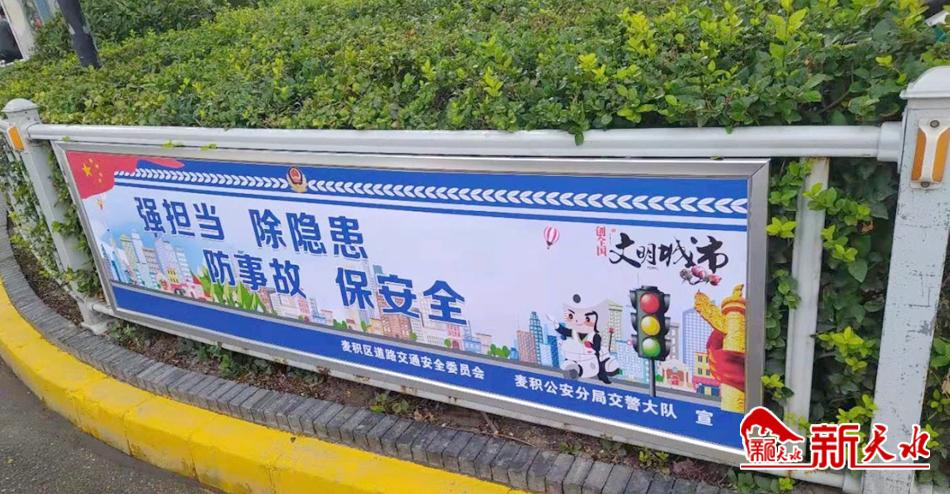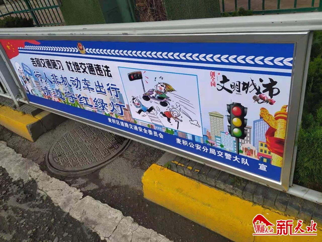 “人人都是天水形象,个个都是文明使者” “生命无价,酒后禁驾”“你让我让,路路畅通”,9月1日,记者在麦积区街头看到让人耳目一新的街景,只见在人行道隔离栏上设立了不少制作精美、醒目的文明交通提示语宣传栏,简洁、通俗的文字让市民一目了然,蓝底白字的设计也十分醒目,成为麦积区街头一道靓丽的风景。 记者从天水市公安局麦积分局交警大队采访时获悉,为全面实施“文明交通行动计划”,提高全民文明交通意识,引导群众树立“讲文明、树新风”风尚,按照区委、区政府文明创城相关要求,麦积公安分局交警大队在陇昌路道路隔离栏和埠南路人行道隔离栏设立了数十个文明交通提示语宣传栏,目的在于营造良好的“创城”宣传氛围,有效提高群众对文明城市创建的知晓率和参与度。