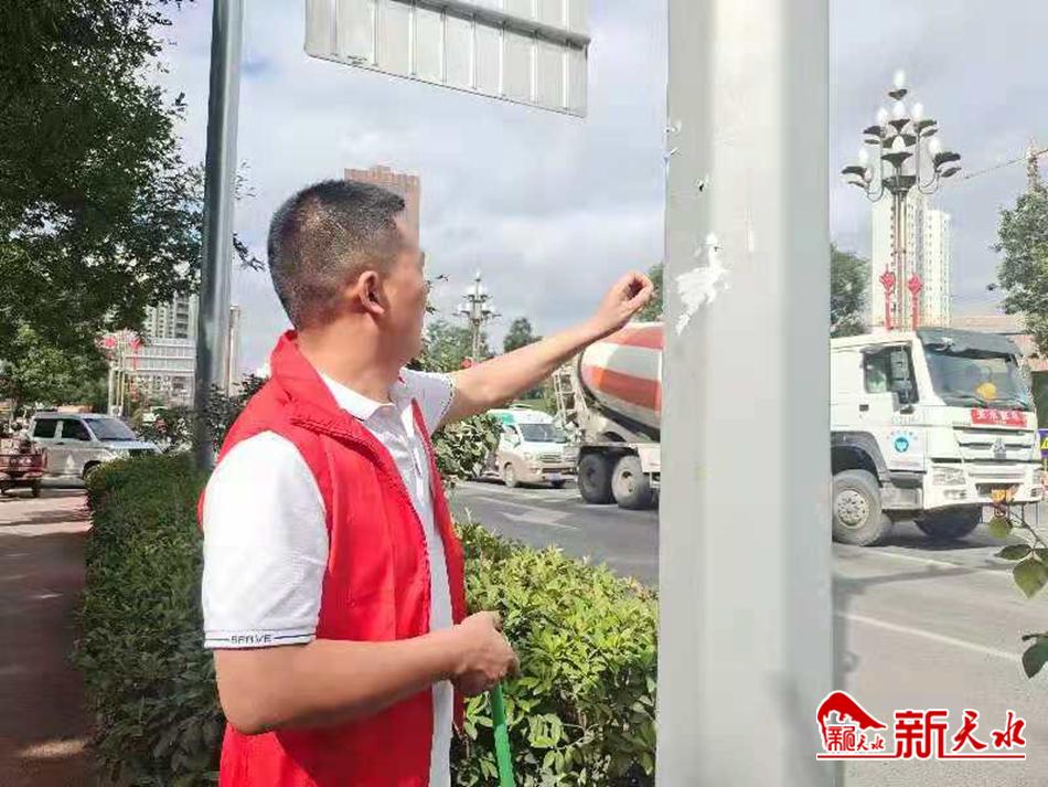 近日,秦州区七里墩社区志愿者深入到区辖区街巷,清理整治小广告、乱贴乱画、乱扔乱倒行为,宣传文明养犬、垃圾分类、疫情防控等知识。 与此同时,广泛动员社区居民积极参与志愿活动,增强广大居民创建文明城市责任感和使命感。