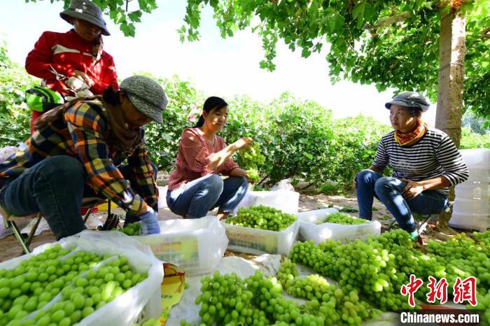 图为果农们忙着采摘成熟的葡萄。 王斌银 摄