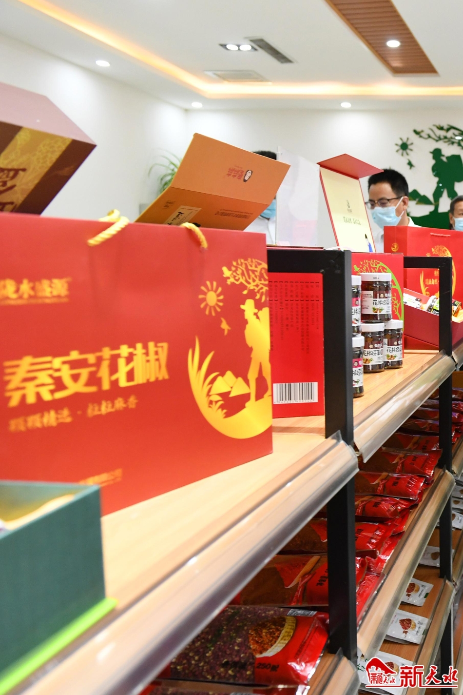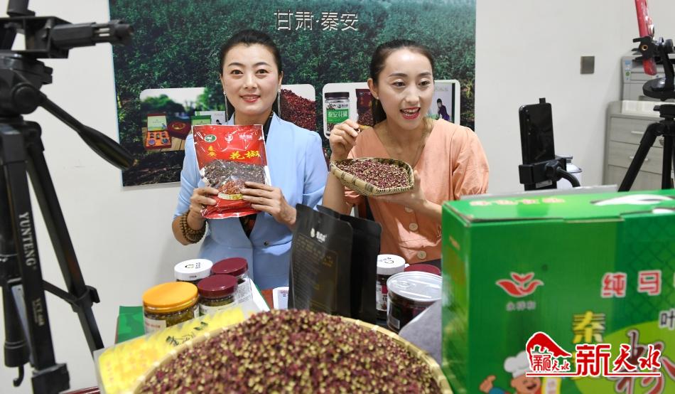 9月5日上午,甘肃盛源菊香农业发展有限公司员工在直播带货,线上销售秦安花椒等农产品。