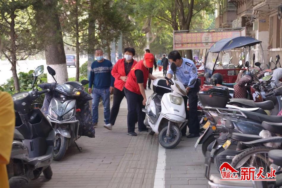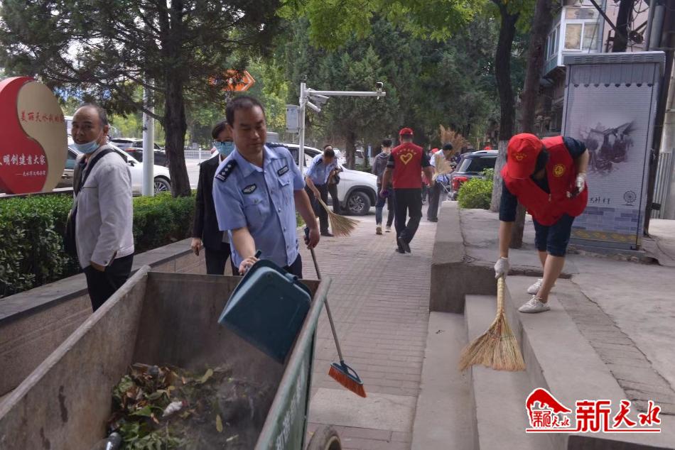 9月10日一大早,身着红马甲的天水市公安局交警支队志愿者来到岷山路,手持扫把和簸箕,配合环卫工及小区保洁人员,仔细检查清理着背街处、人行道上的垃圾、杂草以及墙体、灯杆广告,同时将路边乱停乱放的车辆移挪至规划停车点。在岷山菜市场,一些小商贩提着筐子在路边售卖水果蔬菜,志愿者们和综合执法人员一道上前劝说,让他们进入市场售卖,不要在路边摆摊,影响人行道的通畅和市容环境。