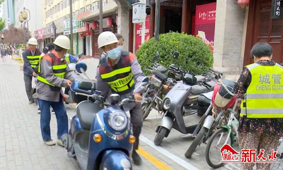 9月14日,记者在秦州区民主路看到,执法局的工作人员在开展非机动车辆规范挪移工作,他们将停车点以外的非机动车移到规划停车点,将停车点内逆向停放的车辆按箭头指示方向规范停放。