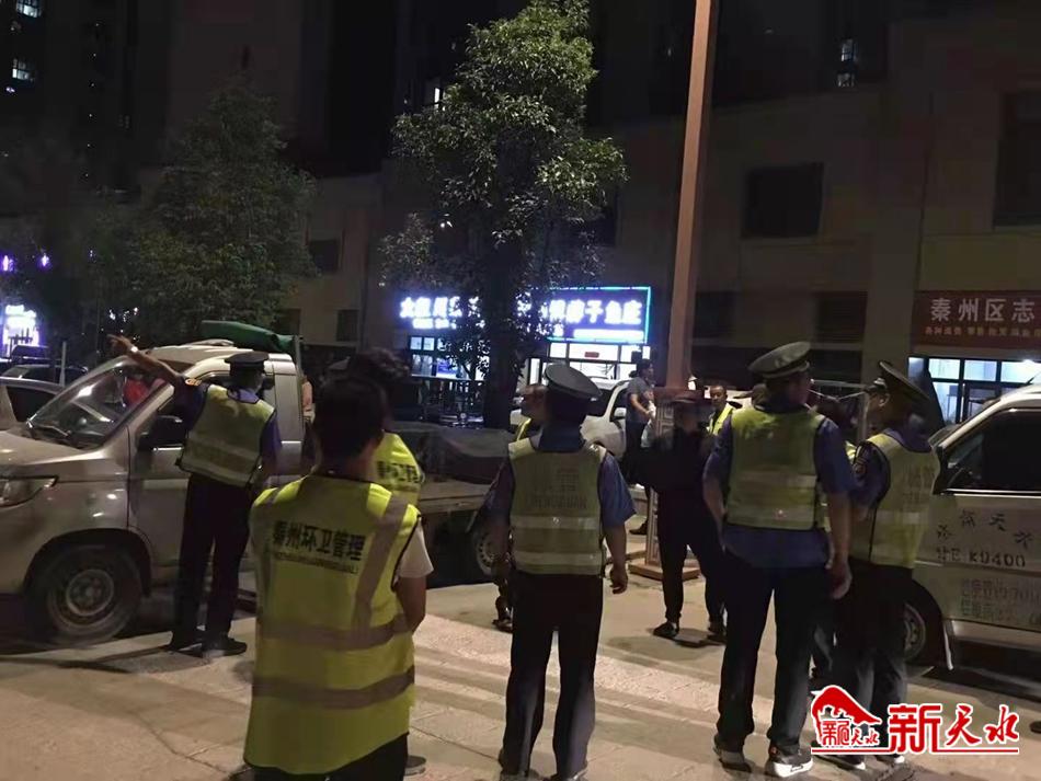 新天水讯 9月13日至14日,秦州区执法局成纪新城中队联合七里墩环卫所,对辖区碧桂园东门夜间流动摊点及店外经营行为经行了集中整治。