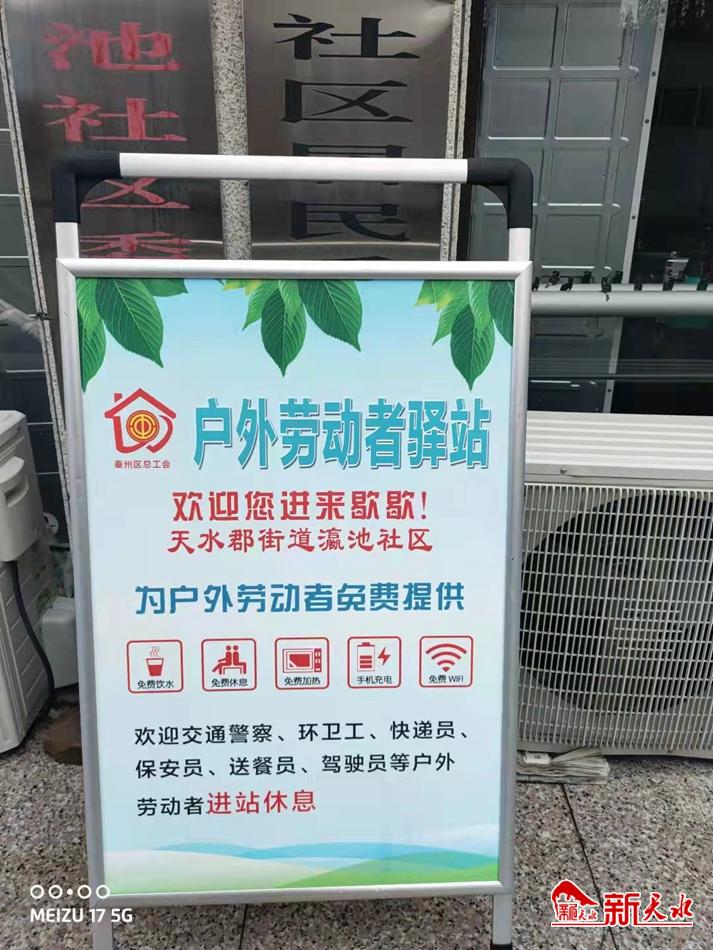 新天水讯 秦州区天水郡街道瀛池社区“爱心驿站”挂牌后,迅速得到了社区居民和户外工作者的认可和喜爱,环卫工人在忙碌之余也有了休息场所。
