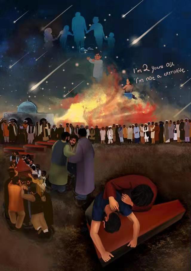 赵立坚向在场记者展示一幅漫画,描绘了阿富汗一场不同寻常的葬礼。赵立坚表示,经新华社海外社交媒体账号播发后,令许多海外网友唏嘘泪目。8月29日,美军发动空袭,炸毁阿富汗首都喀布尔的一处民宅,炸死了一家10口,包括7个孩子。事后美军只是发表声明称,将会评估空袭造成的平民伤亡。玛丽卡和苏玛雅只有两岁,在空袭中被炸身亡。这幅漫画因此取名《两岁“恐怖分子”的葬礼》。漫画描述的是7个夭折的孩子下葬的瞬间。画面中心是挖好的墓坑,大小不一的棺材依次排开,送葬的人们正将一口棺材抬进墓坑。(总台央视记者 申杨 孔禄渊)