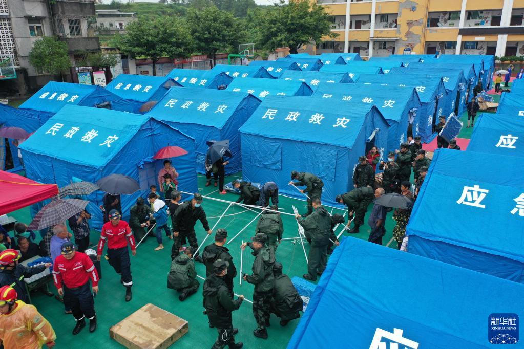 9月16日,武警四川总队泸州支队官兵为受灾群众搭建帐篷(无人机照片)。新华社发(张爽 摄)